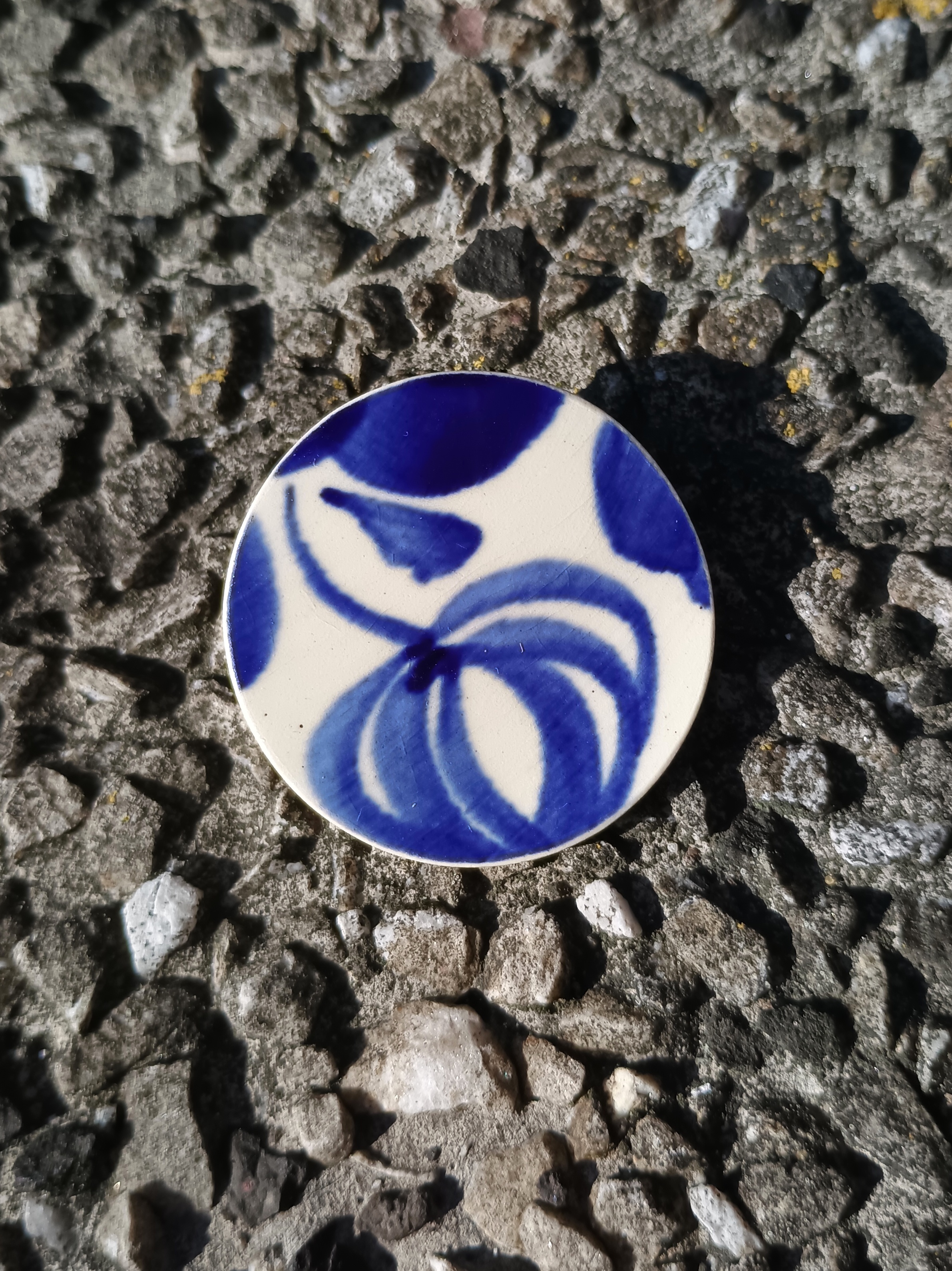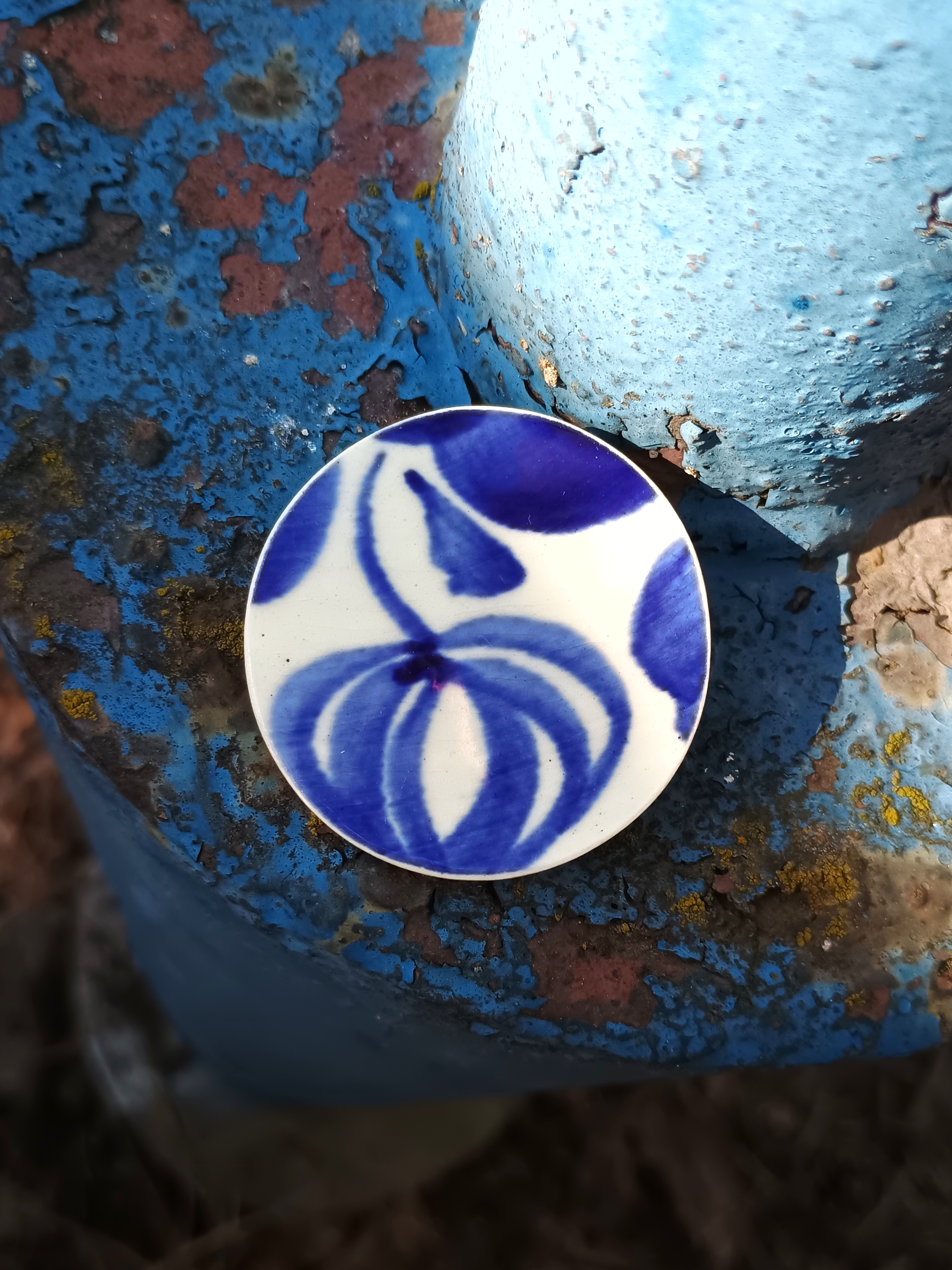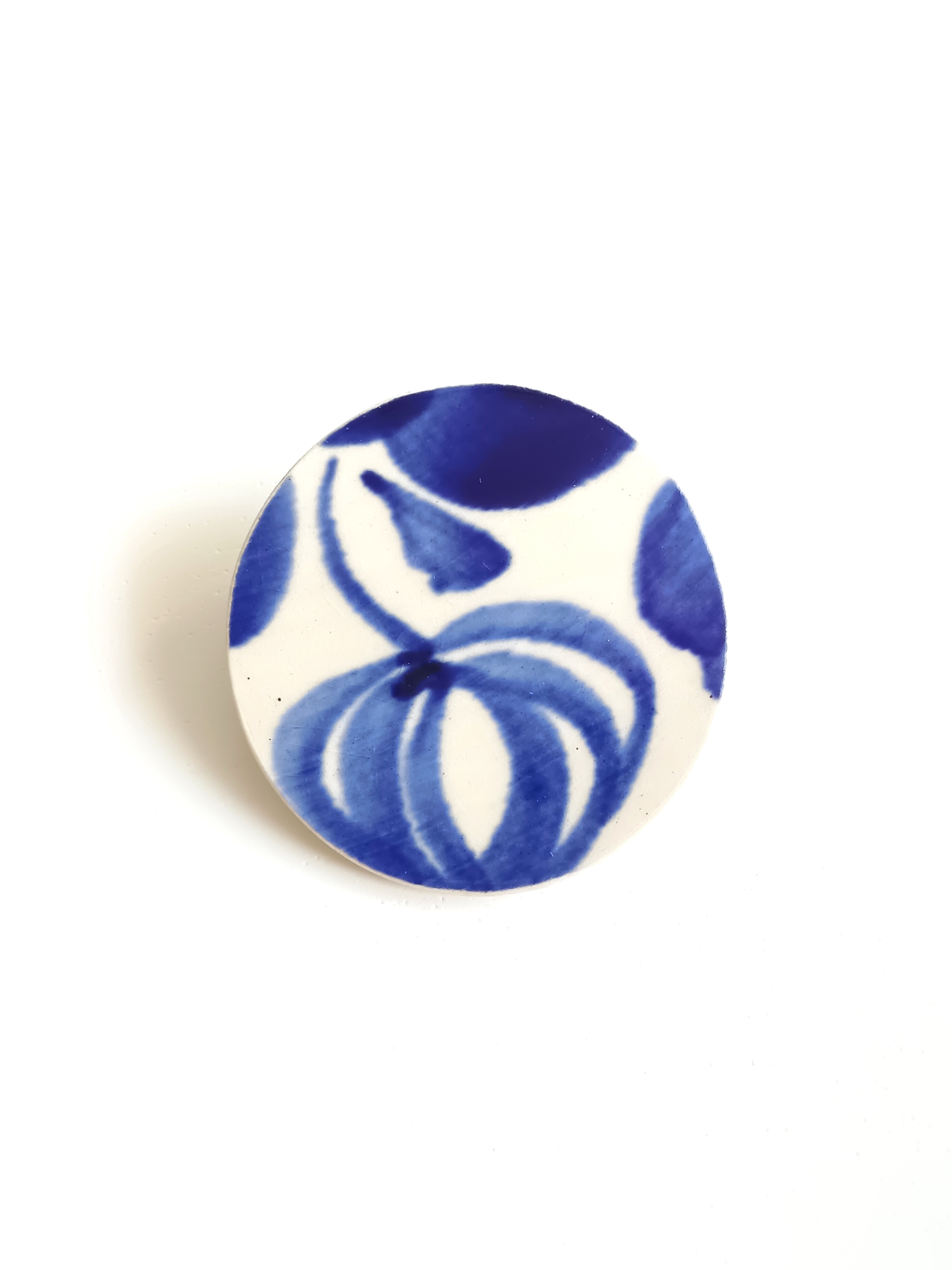 Historia fajansu włocławskiego sięga 1873 roku. Zakładów było kilka, zmieniali się właściciele i lokalizacje. Produkcja najbardziej rozwinęła się po II WŚ, kiedy w miejscowych zakładach powstawał nie tylko fajans, ale również porcelit i porcelana. Zróżnicowane było także wzornictwo - produkowano nie tylko naczynia, ale również elementy wyposażenia wnętrz (lampy, świeczniki, żyrandole). Mimo tej różnorodności, najbardziej rozpoznawalnym wyrobem z Włocławka jest talerz w ręcznie malowane kobaltowe kwiaty (z takich najchętniej korzystam :). I mimo, że najdłużej działająca fabryka zakończyła działalność w 1991 roku, dzięki lokalnym inicjatywom produkcja fajansu została wznowiona i trwa do dziś! Oto broszka, którą wykonałam z fragmentu fajansu włocławskiego, ręcznie malowanego w kobaltowe kwiaty. Kawałek stłuczki oszlifowałam w okrągły kształt i połączyłam z metalowym zapięciem. Ceramikę zeszlifowałam również z grubości, dzięki czemu broszka nie jest masywna. Brzegi pokryłam lakierem, co sprawia, że nie brudzą się i nie chłoną wilgoci. Średnica elementu ceramicznego: 40 mm. Unikat - każdy z moich wyrobów występuje w jednym egzemplarzu. Upcykling - nie reprodukuję wykorzystywanych wzorów, niczego nie domalowuję - wykorzystuję wyłącznie oryginalne naczynia i motywy, które się na nich znajdują. Tym samym, stłuczce z odzysku nadaję nowe życie.