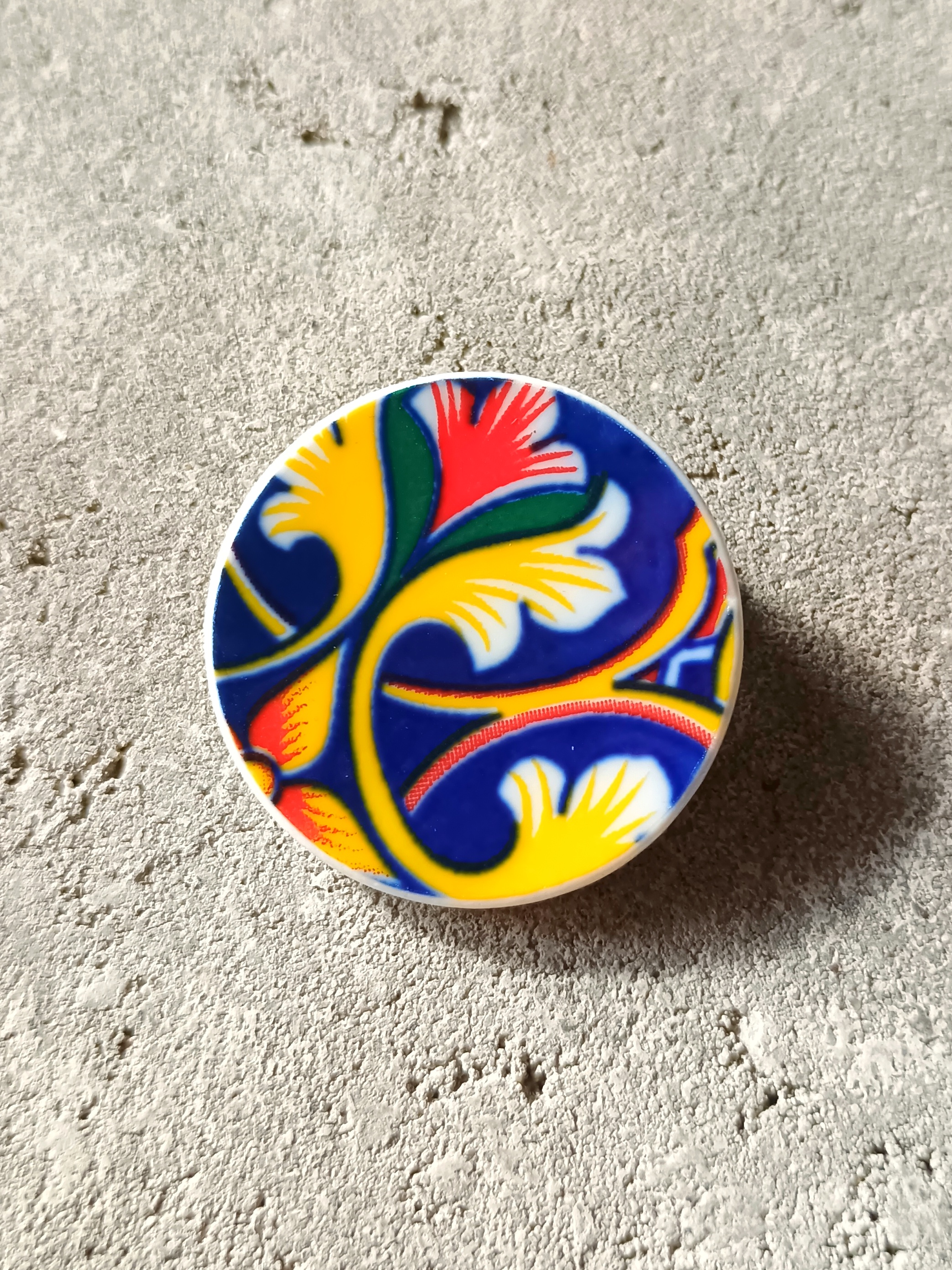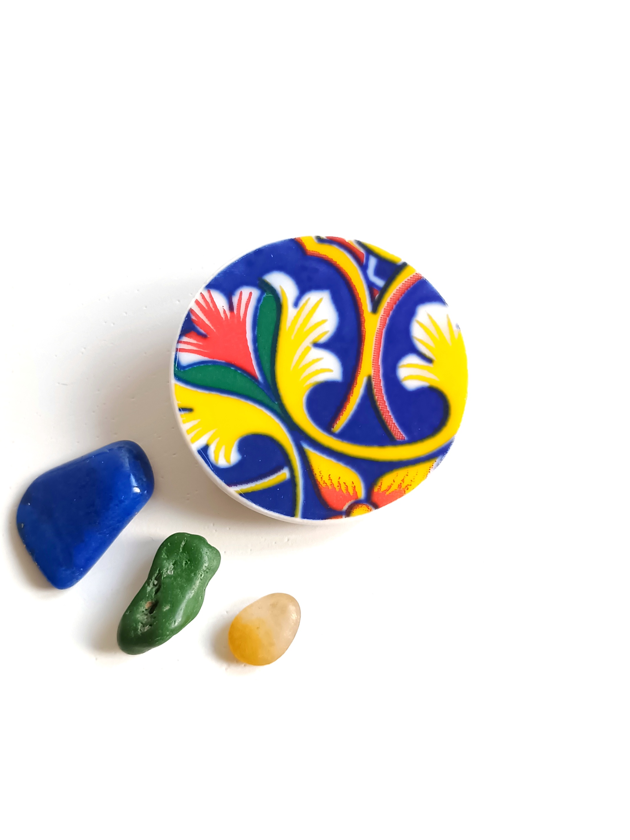 Okrągła broszka, którą wykonałam z fragmentu stłuczonego talerza w orientalne wzory. Kawałek stłuczki oszlifowałam i połączyłam z metalowym zapięciem. Brzegi pokryłam lakierem, co sprawia, że nie brudzą się i nie chłoną wilgoci. Średnica elementu ceramicznego: 33 mm. Unikat - każdy z moich wyrobów występuje w jednym egzemplarzu. Upcykling - nie reprodukuję wykorzystywanych wzorów, niczego nie domalowuję - wykorzystuję wyłącznie oryginalne naczynia i motywy, które się na nich znajdują. Tym samym, stłuczce z odzysku nadaję nowe życie.