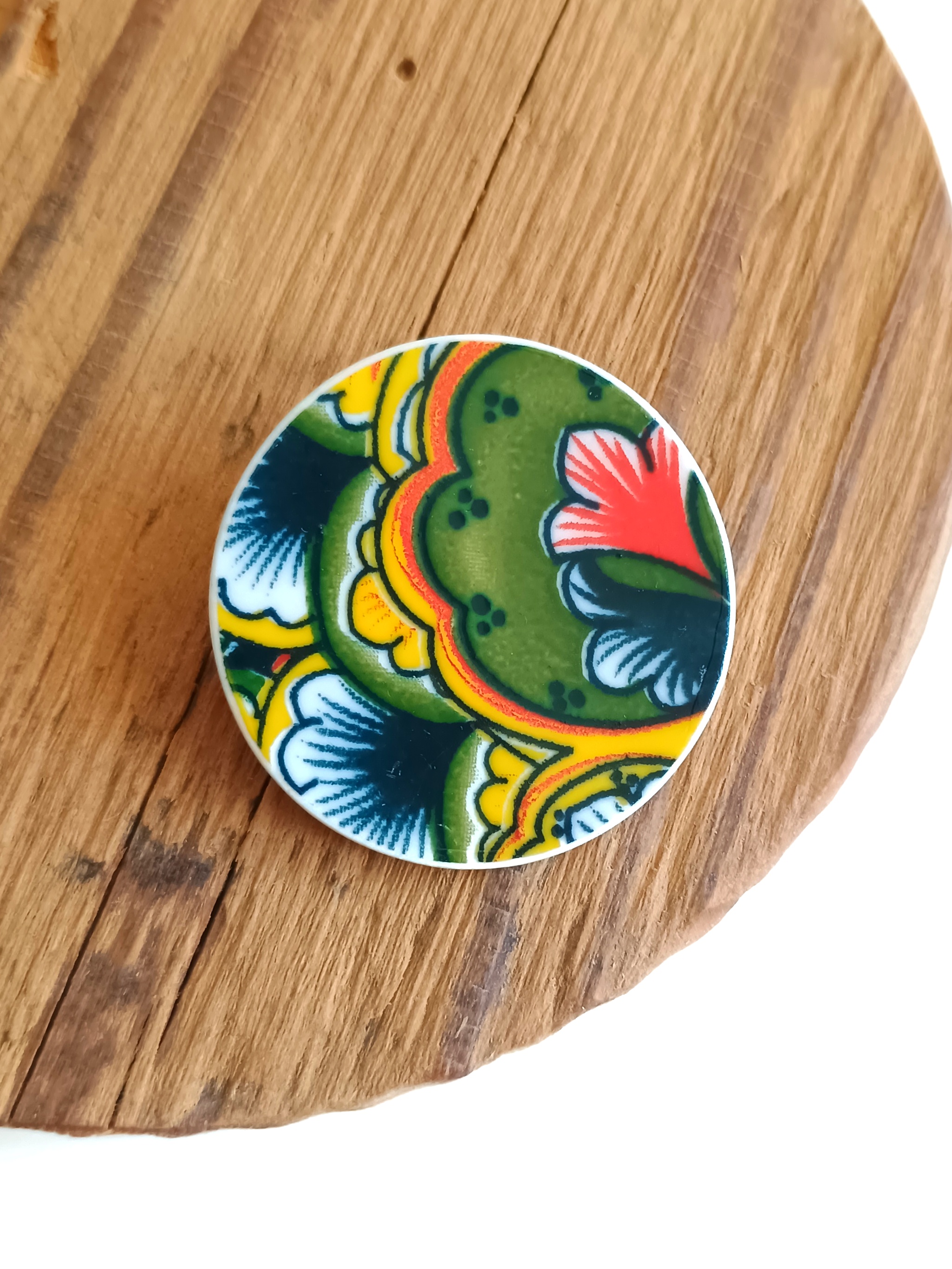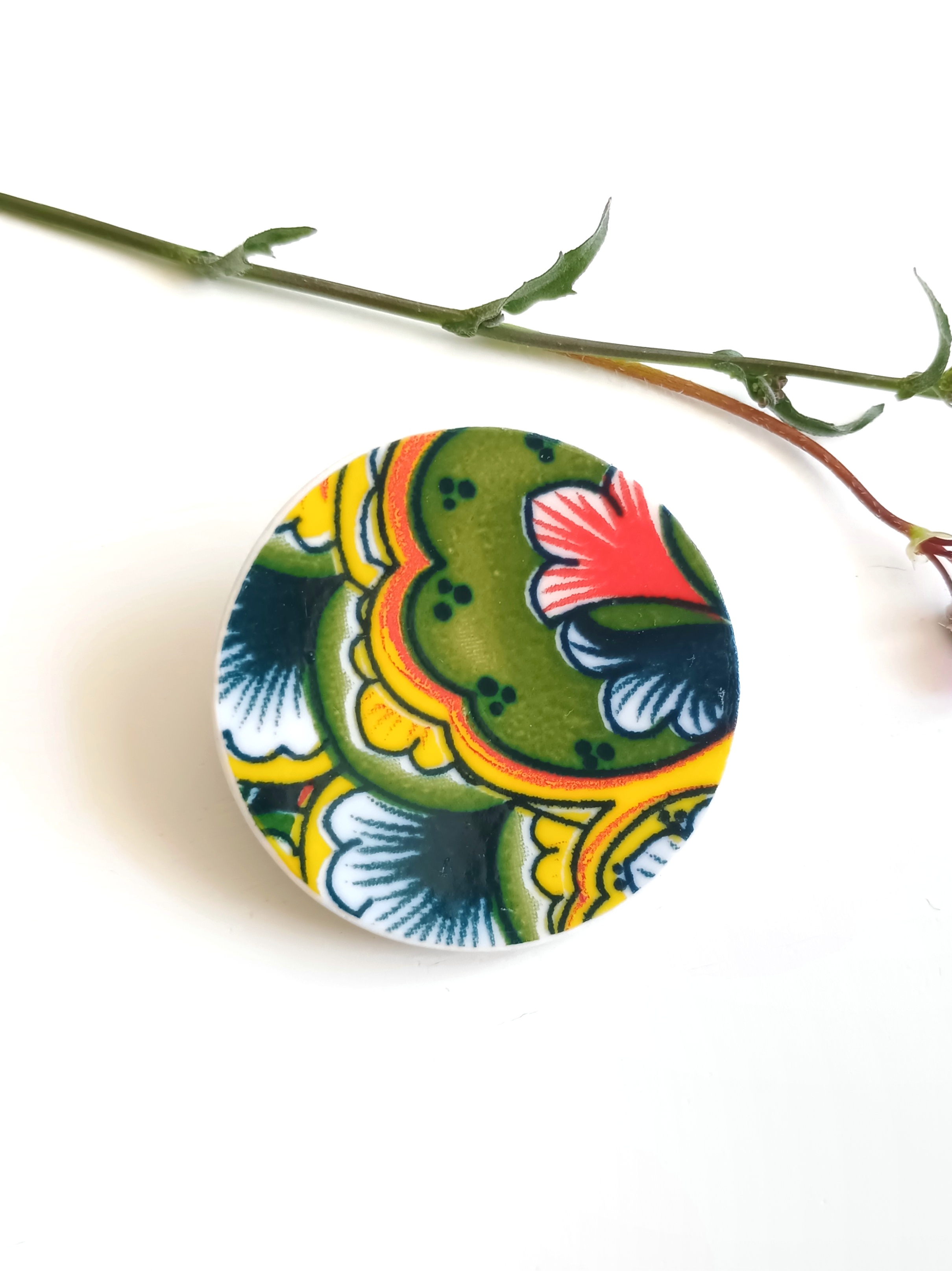 Okrągła broszka, którą wykonałam z fragmentu stłuczonego talerza w orientalne wzory. Kawałek stłuczki oszlifowałam i połączyłam z metalowym zapięciem. Brzegi pokryłam lakierem, co sprawia, że nie brudzą się i nie chłoną wilgoci. Średnica elementu ceramicznego: 35 mm. Unikat - każdy z moich wyrobów występuje w jednym egzemplarzu. Upcykling - nie reprodukuję wykorzystywanych wzorów, niczego nie domalowuję - wykorzystuję wyłącznie oryginalne naczynia i motywy, które się na nich znajdują. Tym samym, stłuczce z odzysku nadaję nowe życie.