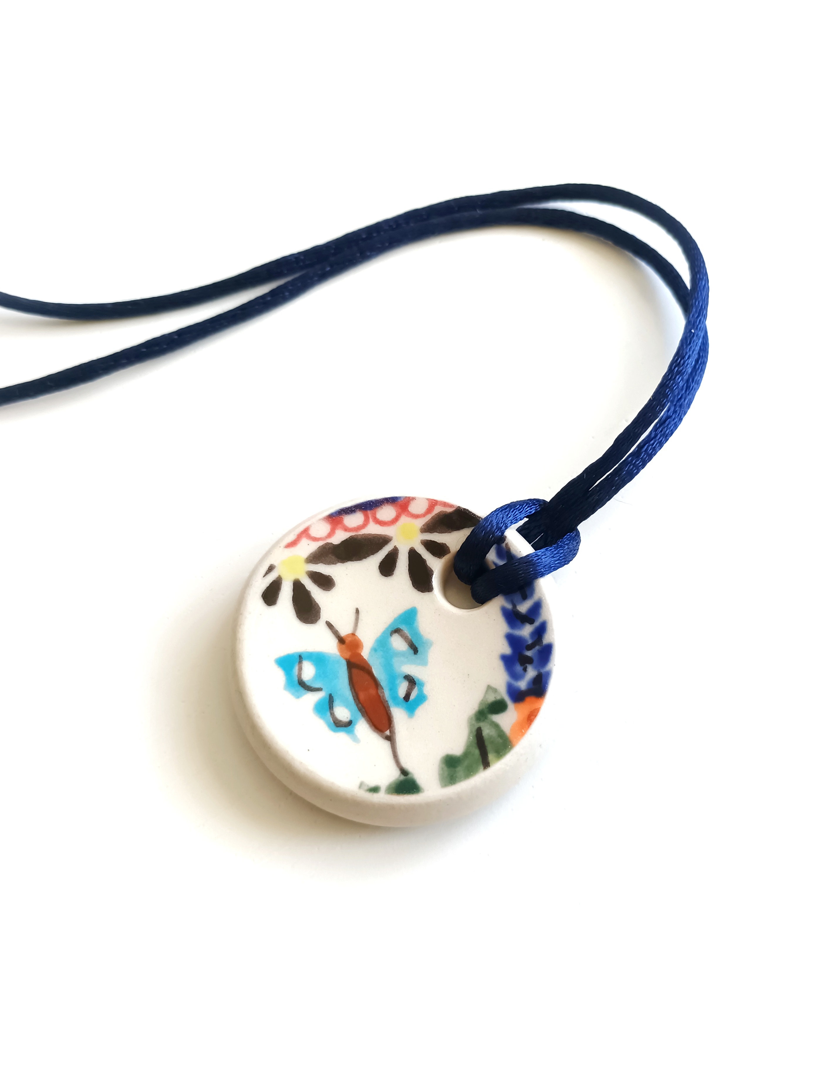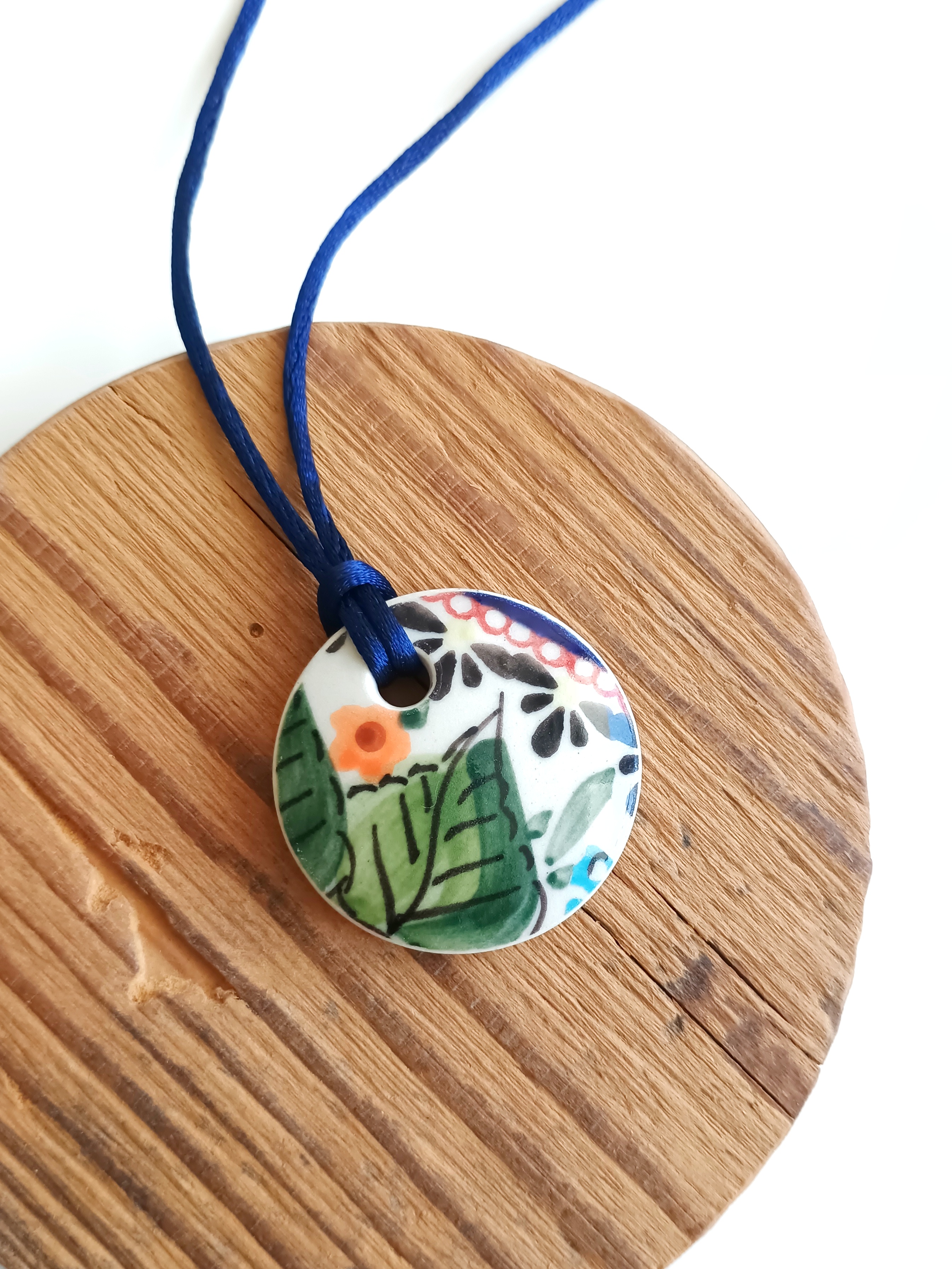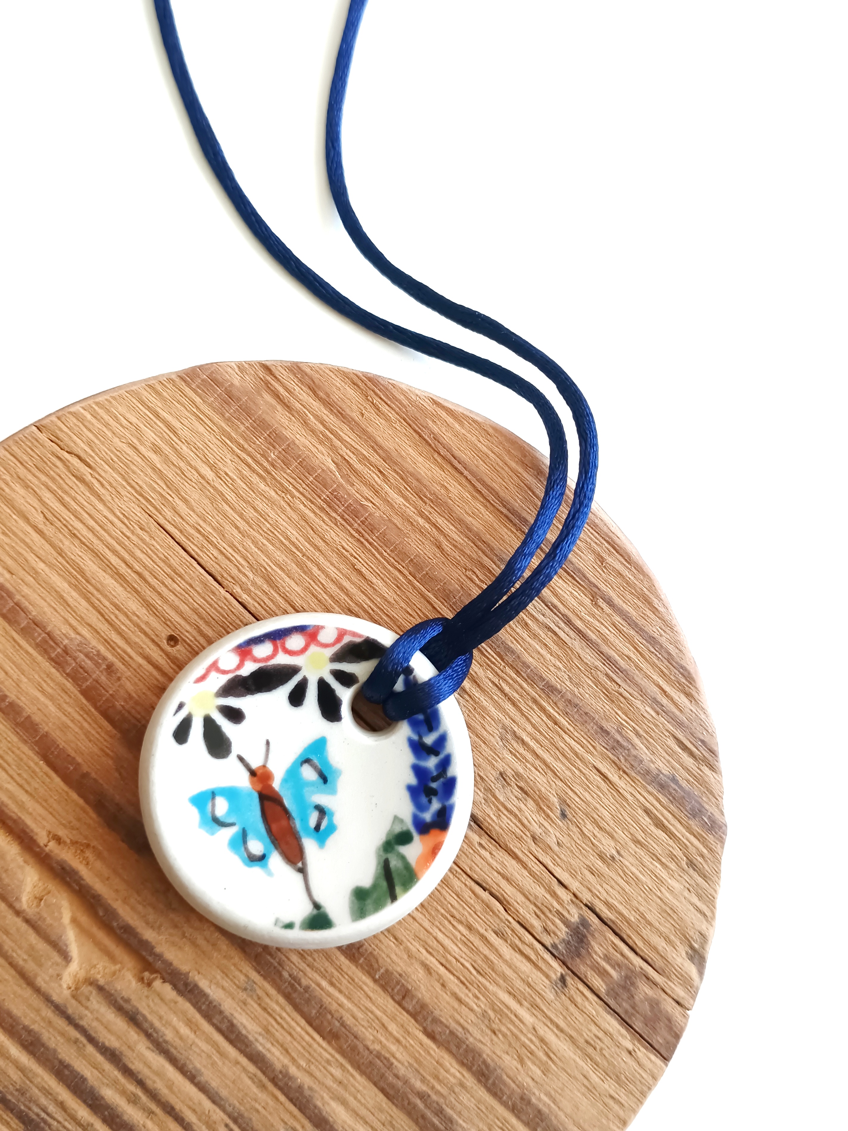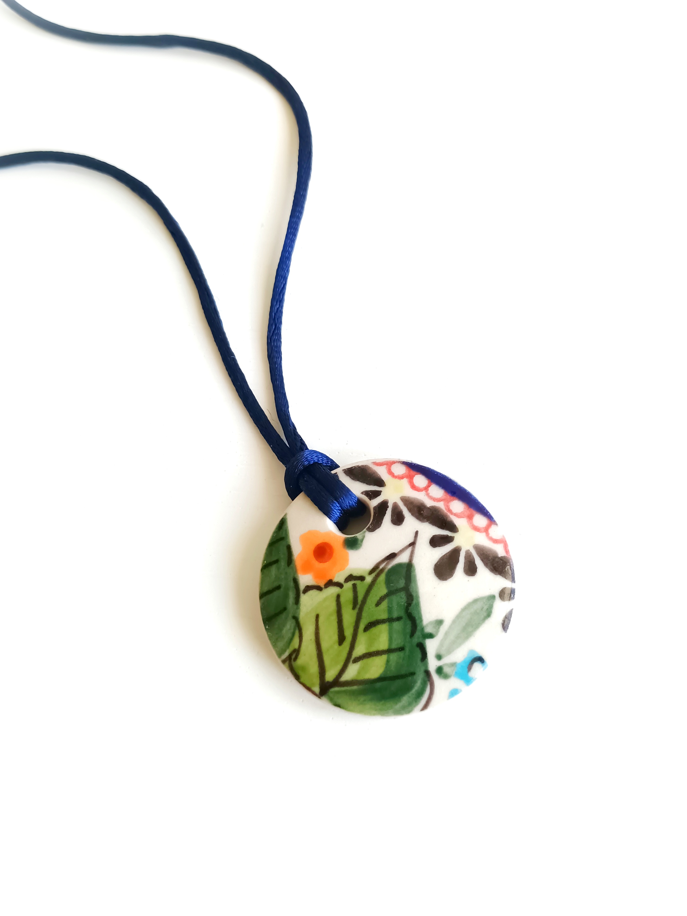 Ceramika w Bolesławcu i jego okolicach produkowana była już w XIV wieku. Do dziś najważniejszy surowiec, czyli glina wydobywany jest na miejscu, a tradycja wyrobu naczyń ceramicznych, rozwijana i kultywowana przez wieki - trwa. Bolesławiec jako marka, tworzona przez kilkadziesiąt różnych manufaktur, znana jest na całym świecie, a charakterystycznego wzoru w kobaltowe kropki nie sposób pomylić z żadnym innym. Co najbardziej wyróżnia Bolesławiec, to że szkliwo nakładane jest ręcznie, za pomocą stempelków z gąbki. Oto naszyjnik, który wykonałam właśnie z fragmentu ceramiki bolesławieckiej. Fragment ze wzorem po obu stronach oszlifowałam w okrągły kształt. Brzegi pokryłam lakierem, co sprawia, że nie brudzą się i nie chłoną wilgoci. Do zawieszki dobrałam satynowy sznureczek w kolorze granatowym. Średnica elementu ceramicznego: 40 mm. Długość sznureczka w całości: ok. 80 cm (naszyjnik zakłada się przez głowę). Sznurek łatwo skrócić lub dobrać swój ulubiony rzemień lub łańcuszek. Upcykling - nie reprodukuję wykorzystywanych wzorów, niczego nie domalowuję - wykorzystuję wyłącznie oryginalne naczynia i motywy, które się na nich znajdują. Tym samym, stłuczce z odzysku nadaję nowe życie.