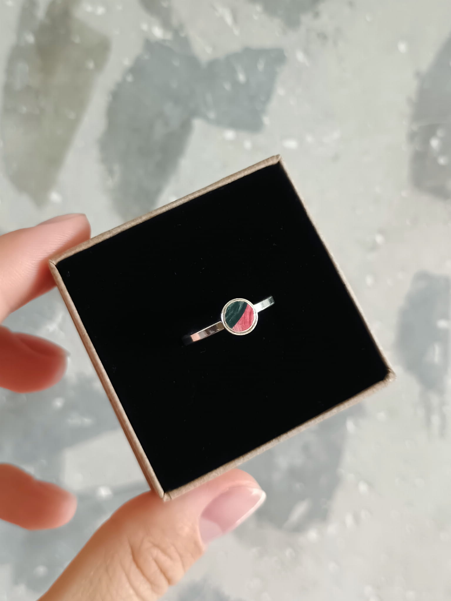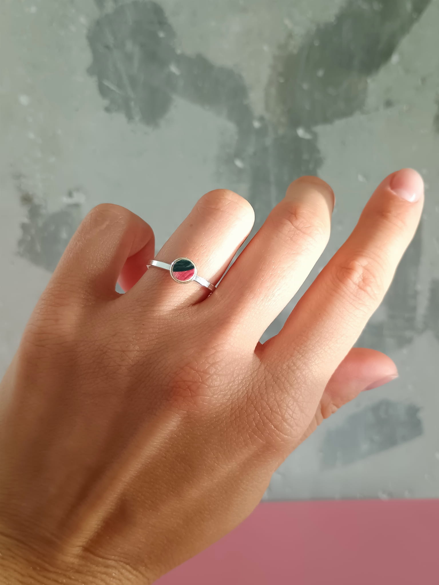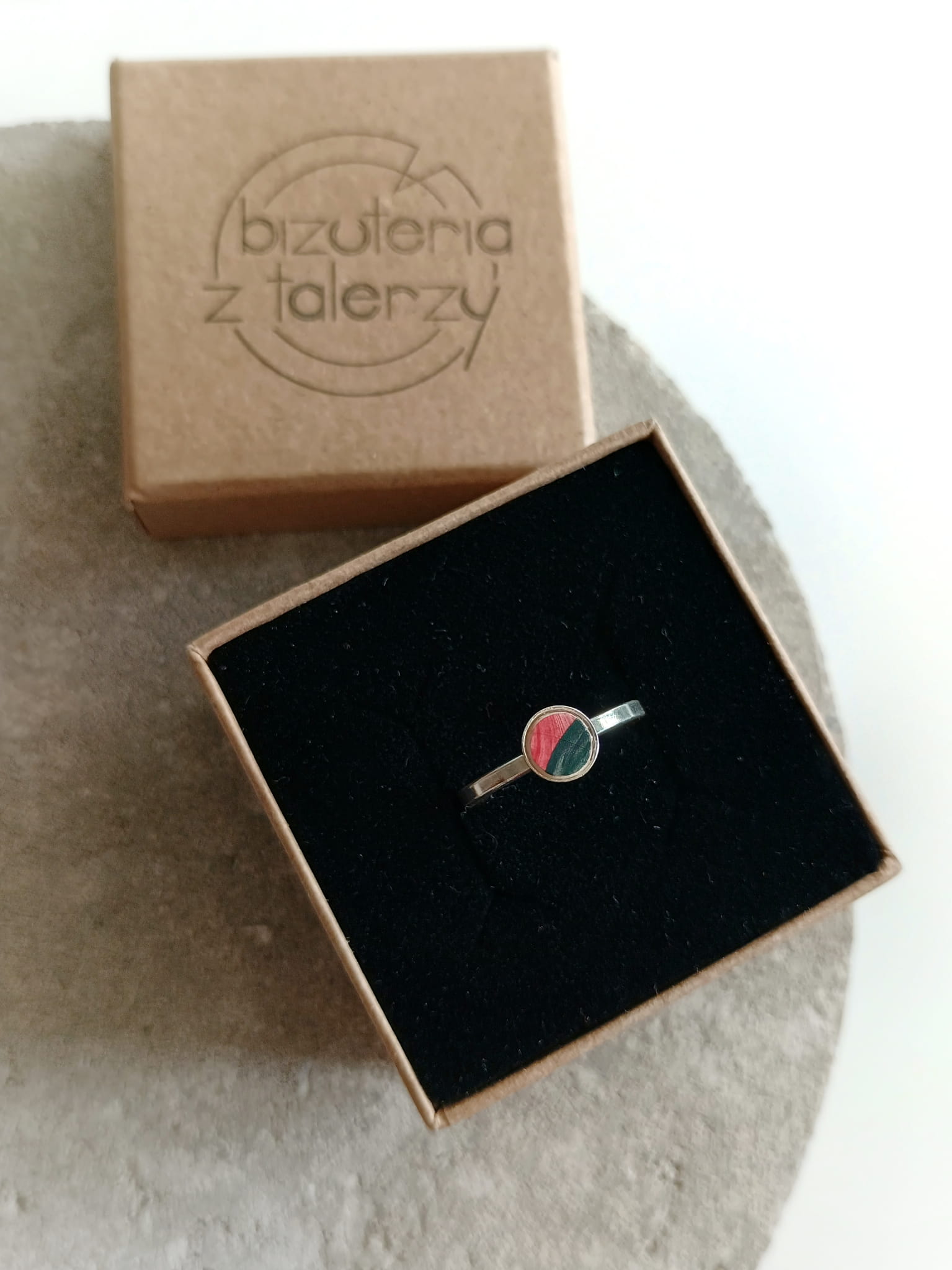Historia fajansu włocławskiego sięga 1873 roku. Zakładów było kilka, zmieniali się właściciele i lokalizacje. Produkcja najbardziej rozwinęła się po II WŚ, kiedy w miejscowych zakładach powstawał nie tylko fajans, ale również porcelit i porcelana. Zróżnicowane było także wzornictwo - produkowano nie tylko naczynia, ale również elementy wyposażenia wnętrz (lampy, świeczniki, żyrandole). Mimo tej różnorodności, najbardziej rozpoznawalnym wyrobem z Włocławka jest talerz w ręcznie malowane kobaltowe kwiaty (z takich najchętniej korzystam :). I mimo, że najdłużej działająca fabryka zakończyła działalność w 1991 roku, dzięki lokalnym inicjatywom produkcja fajansu została wznowiona i trwa do dziś! Oto pierścionek, który wykonałam z fragmentu fajansu włocławskiego ręcznie malowanego w kolorowe wzory. Kawałek stłuczki oszlifowałam w okrągły kształt i połączyłam z bazą wykonaną ze srebra próby 925. Rozmiar: 15 (możliwość powiększenia o 1-2 rozmiary). Średnica "oczka" - elementu ceramicznego: 6 mm. Unikat - każdy z moich wyrobów występuje w jednym egzemplarzu. Upcykling - nie reprodukuję wykorzystywanych wzorów, niczego nie domalowuję - wykorzystuję wyłącznie oryginalne naczynia i motywy, które się na nich znajdują. Tym samym, stłuczce z odzysku nadaję nowe życie.