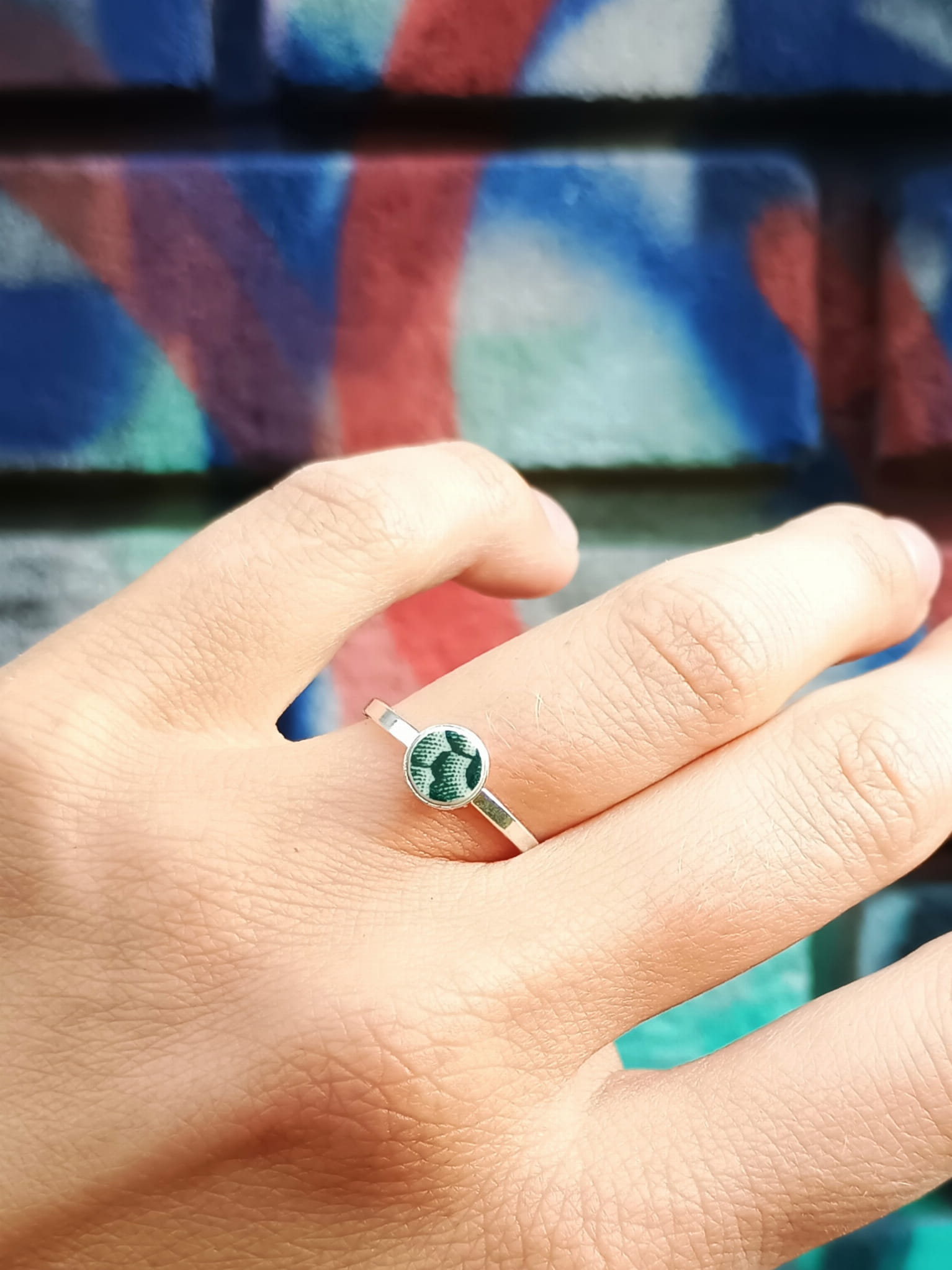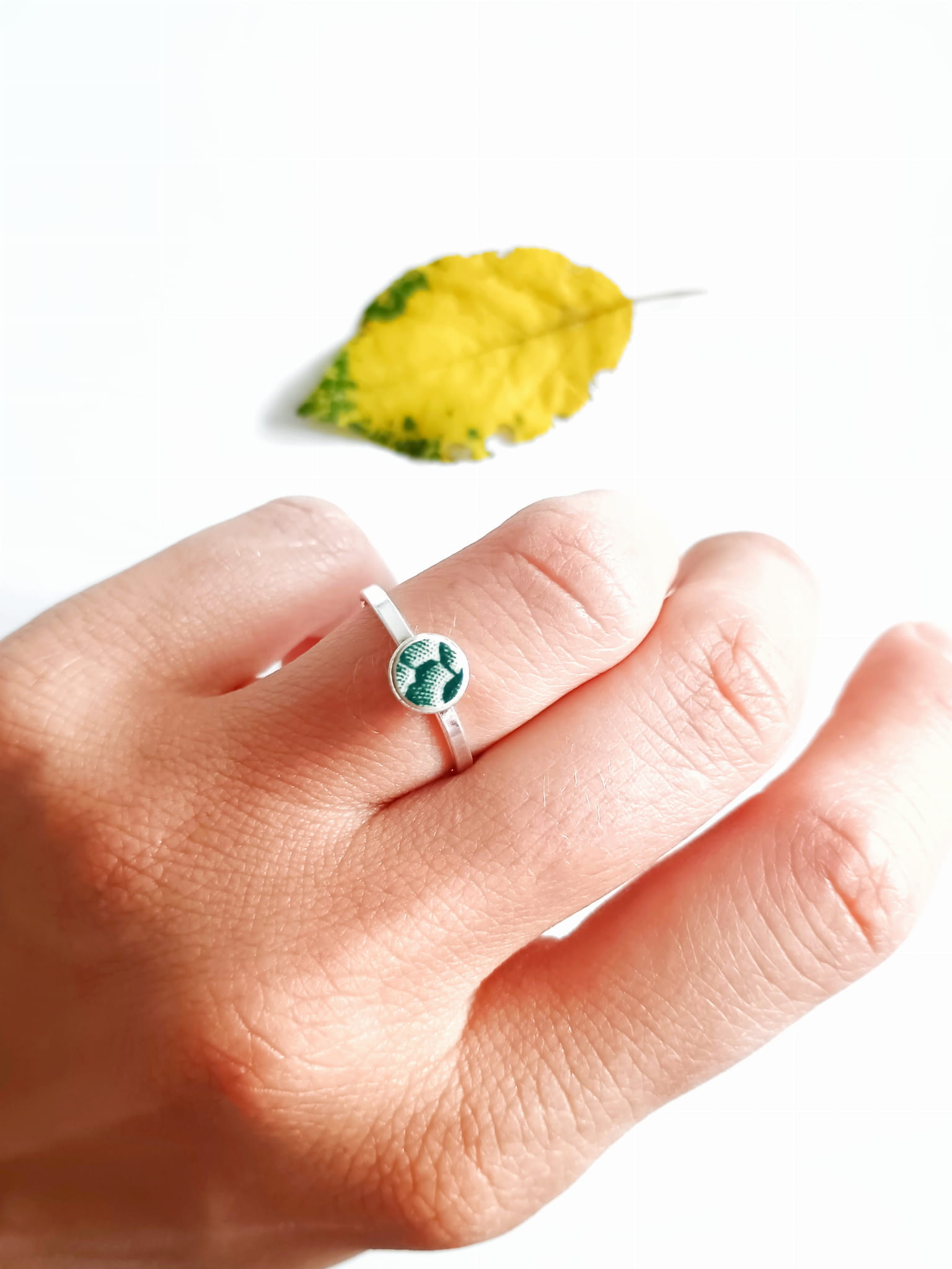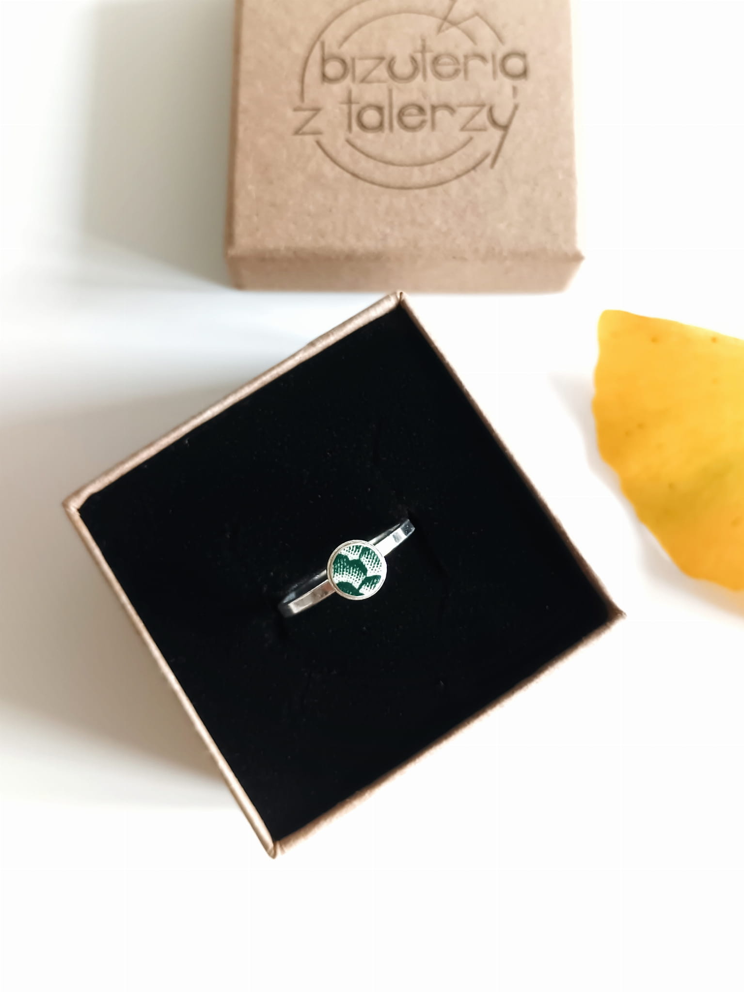Delikatny pierścionek, który wykonałam z fragmentu stłuczonego talerza w zielone kwiatowe wzory. Kawałek stłuczki oszlifowałam w okrągły kształt i połączyłam z bazą wykonaną ze srebra próby 925. Rozmiar: 15 (możliwość powiększenia o 1-2 rozmiary). Średnica "oczka" - elementu ceramicznego: 6 mm. Unikat - każdy z moich wyrobów występuje w jednym egzemplarzu. Upcykling - nie reprodukuję wykorzystywanych wzorów, niczego nie domalowuję - wykorzystuję wyłącznie oryginalne naczynia i motywy, które się na nich znajdują. Tym samym, stłuczce z odzysku nadaję nowe życie.