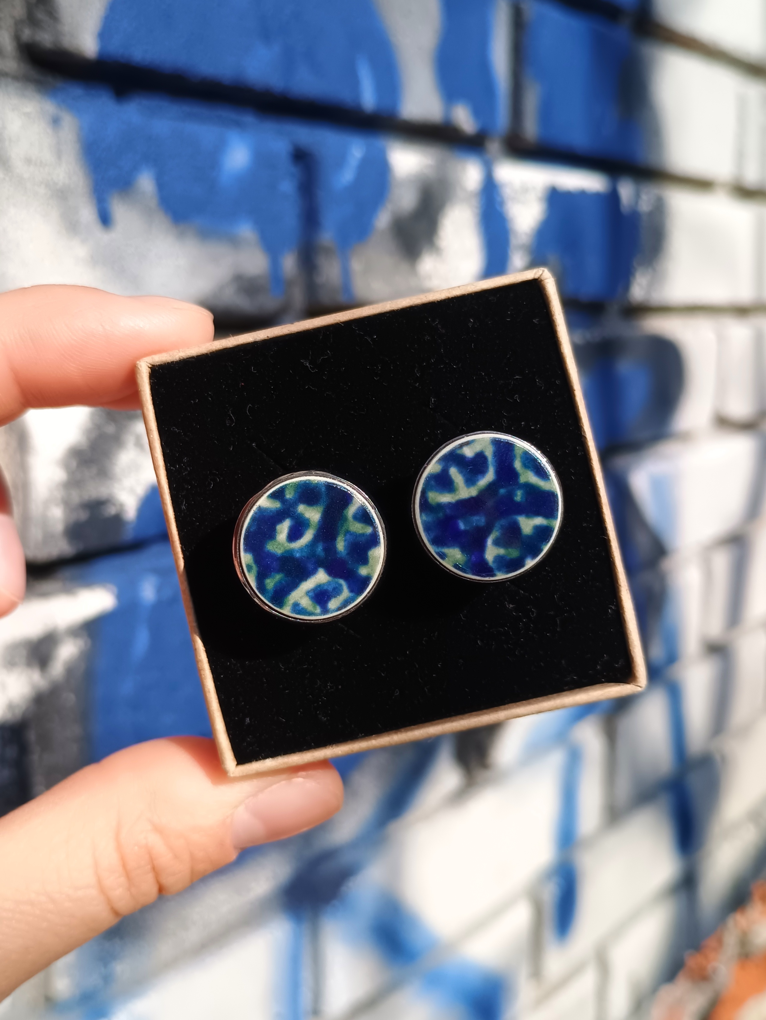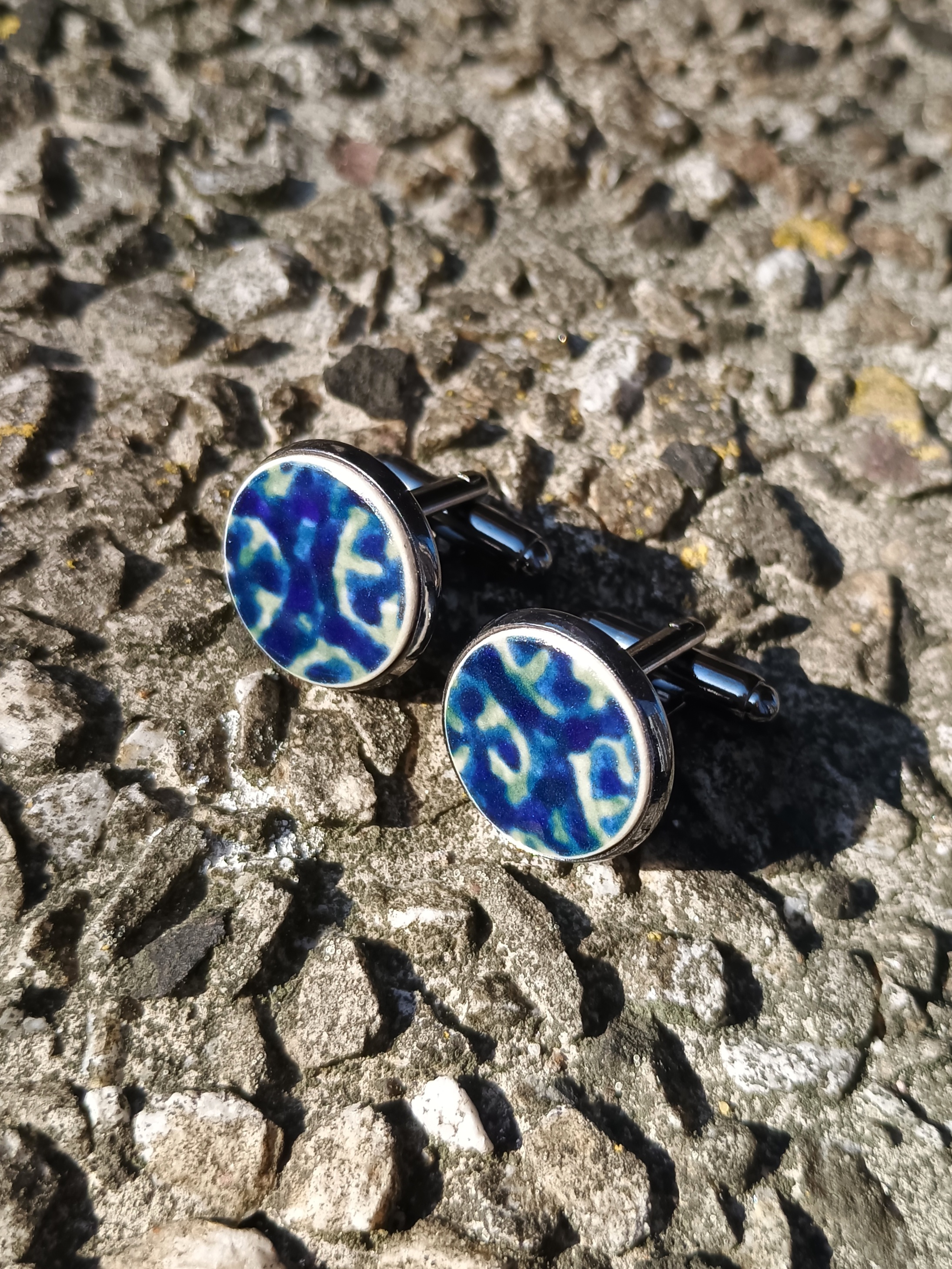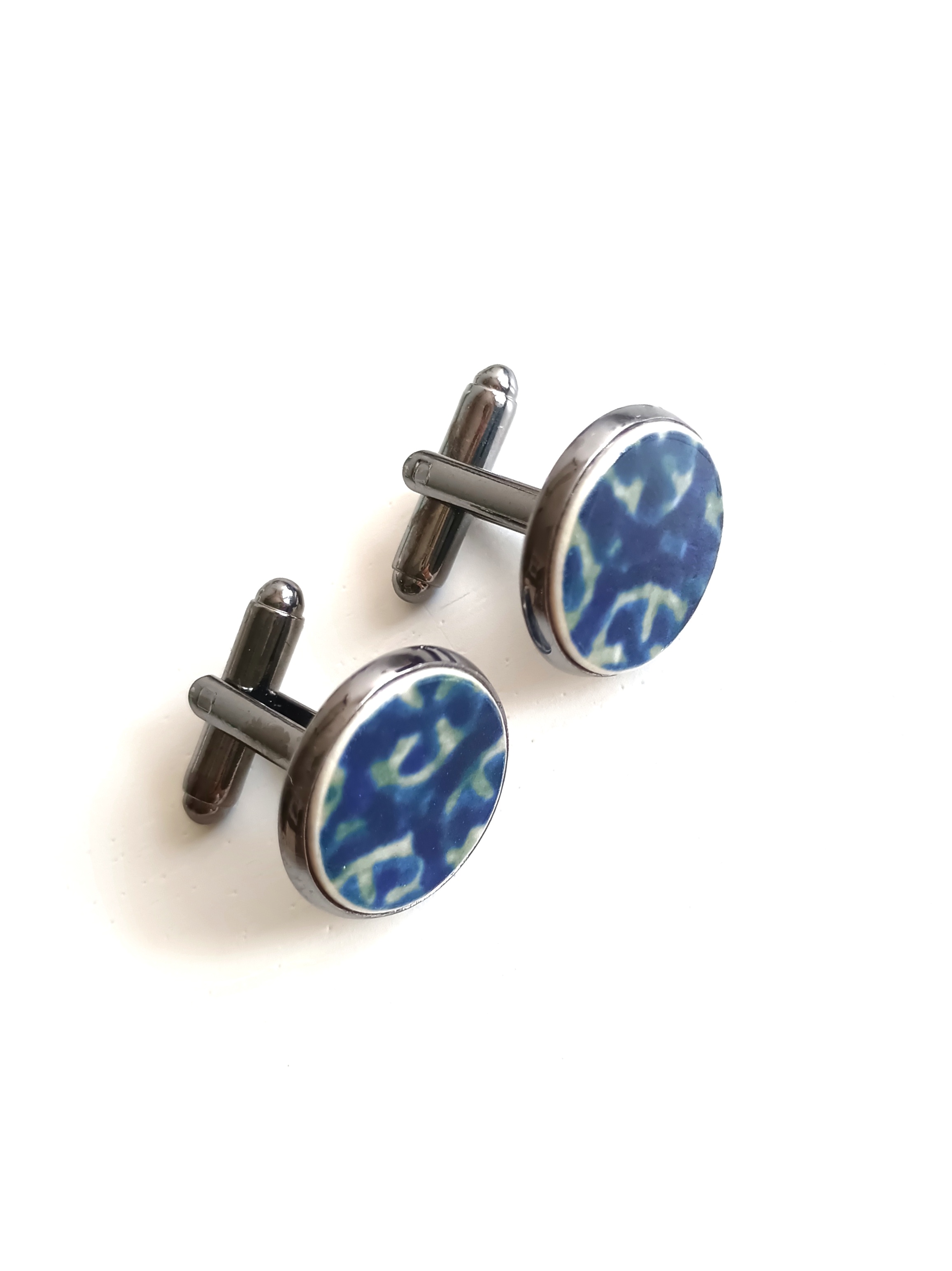 Ceramika w Bolesławcu i jego okolicach produkowana była już w XIV wieku. Do dziś najważniejszy surowiec, czyli glina wydobywany jest na miejscu, a tradycja wyrobu naczyń ceramicznych, rozwijana i kultywowana przez wieki - trwa. Bolesławiec jako marka, tworzona przez kilkadziesiąt różnych manufaktur, znana jest na całym świecie, a charakterystycznego wzoru w kobaltowe kropki nie sposób pomylić z żadnym innym. Co najbardziej wyróżnia Bolesławiec, to że szkliwo nakładane jest ręcznie, za pomocą stempelków z gąbki. Oto spinki do mankietów, które wykonałam z fragmentów stłuczonego talerza, wykonanego właśnie w Bolesławcu. Kawałki stłuczki oszlifowałam w okrągłe kształty i połączyłam z metalowymi zapięciami w kolorze grafitowym. Ceramikę zeszlifowałam również z grubości - jest cieńsza niż pierwotnie, dzięki czemu spinki nie są masywne. Brzegi pokryłam lakierem, co sprawia, że nie brudzą się i nie chłoną wilgoci. Średnica elementów ceramicznych: 16 mm. Unikat - każdy z moich wyrobów występuje w jednym egzemplarzu. Upcykling - nie reprodukuję wykorzystywanych wzorów, niczego nie domalowuję - wykorzystuję wyłącznie oryginalne naczynia i motywy, które się na nich znajdują. Tym samym, stłuczce z odzysku nadaję nowe życie.