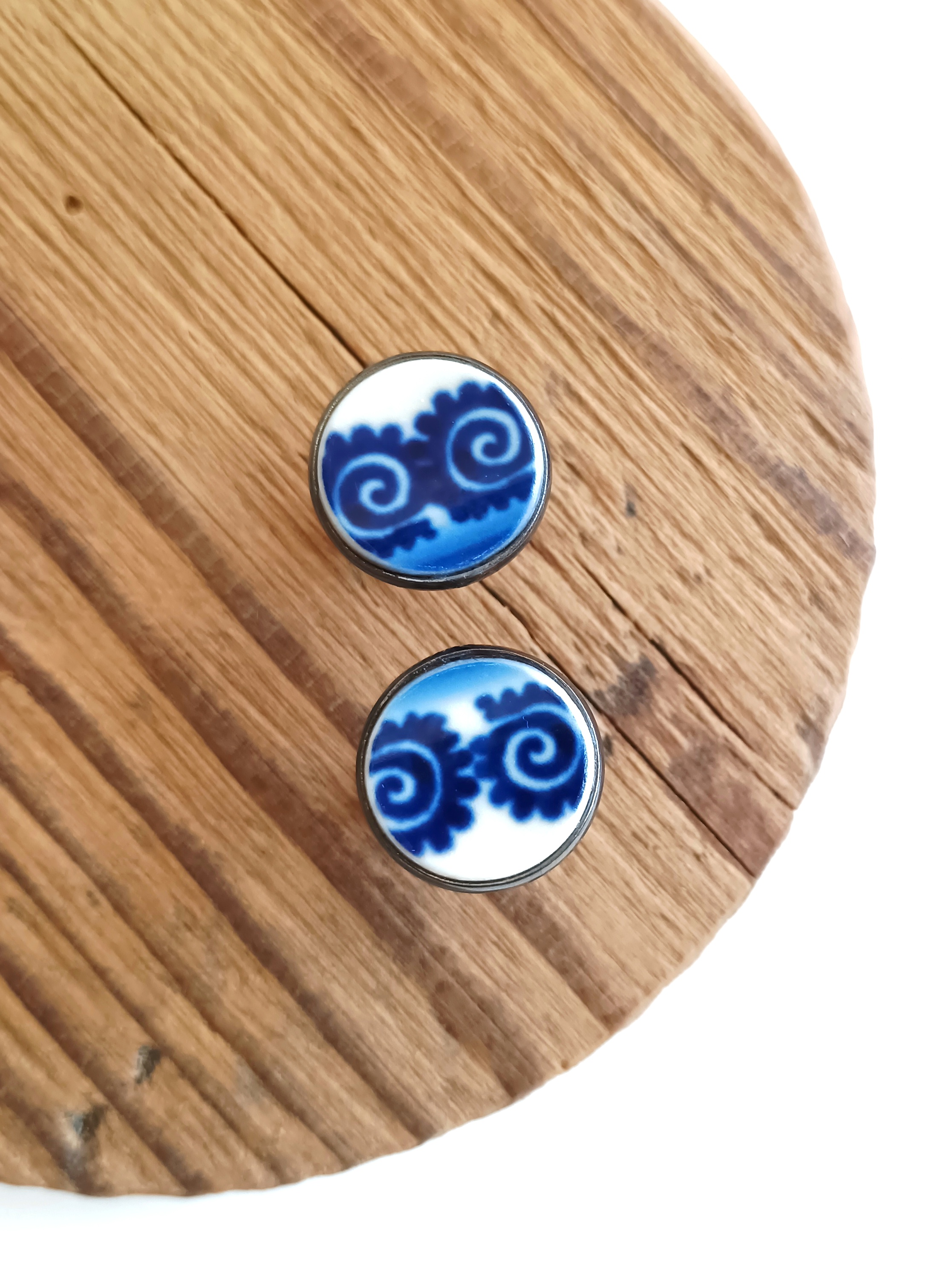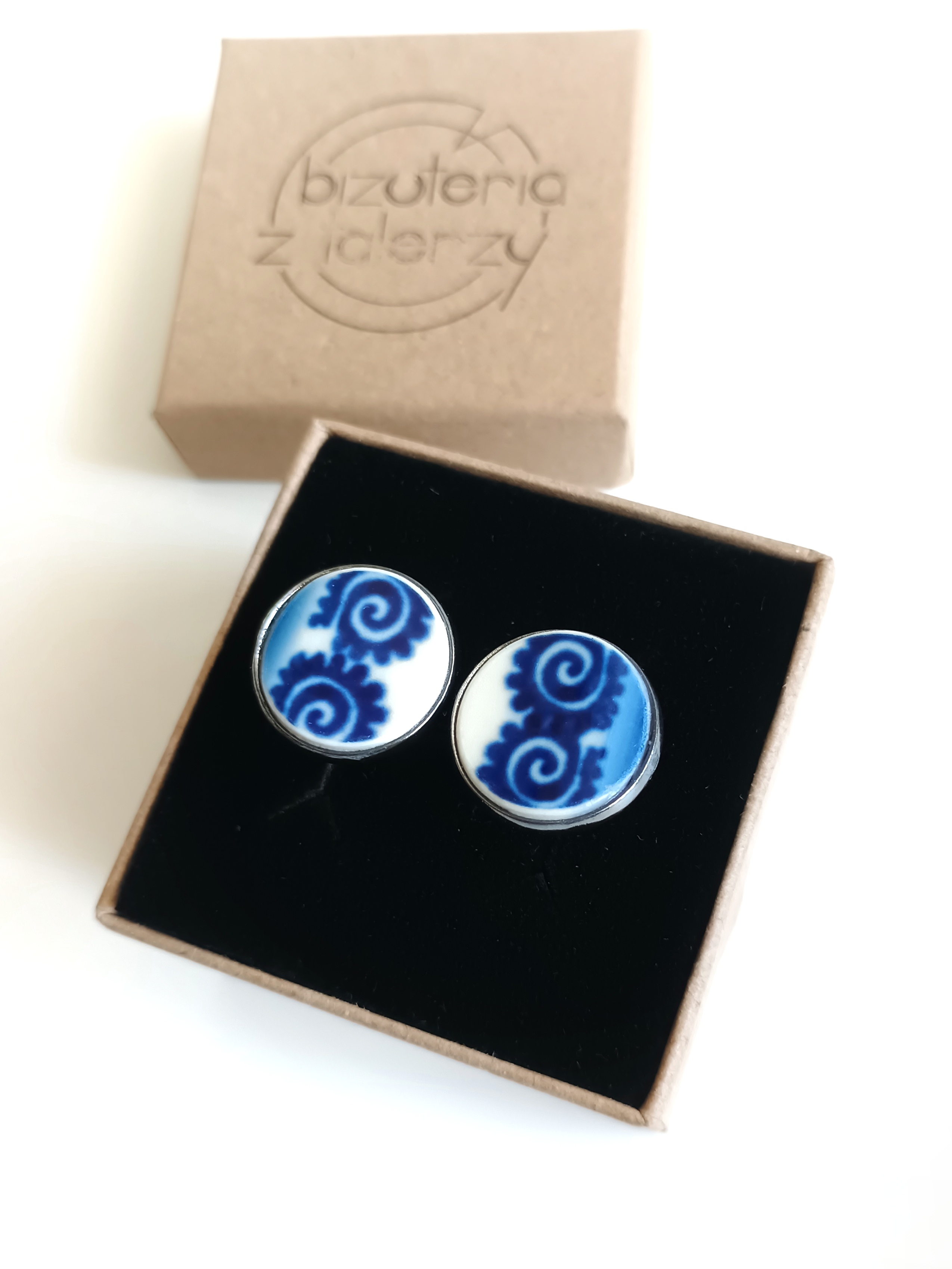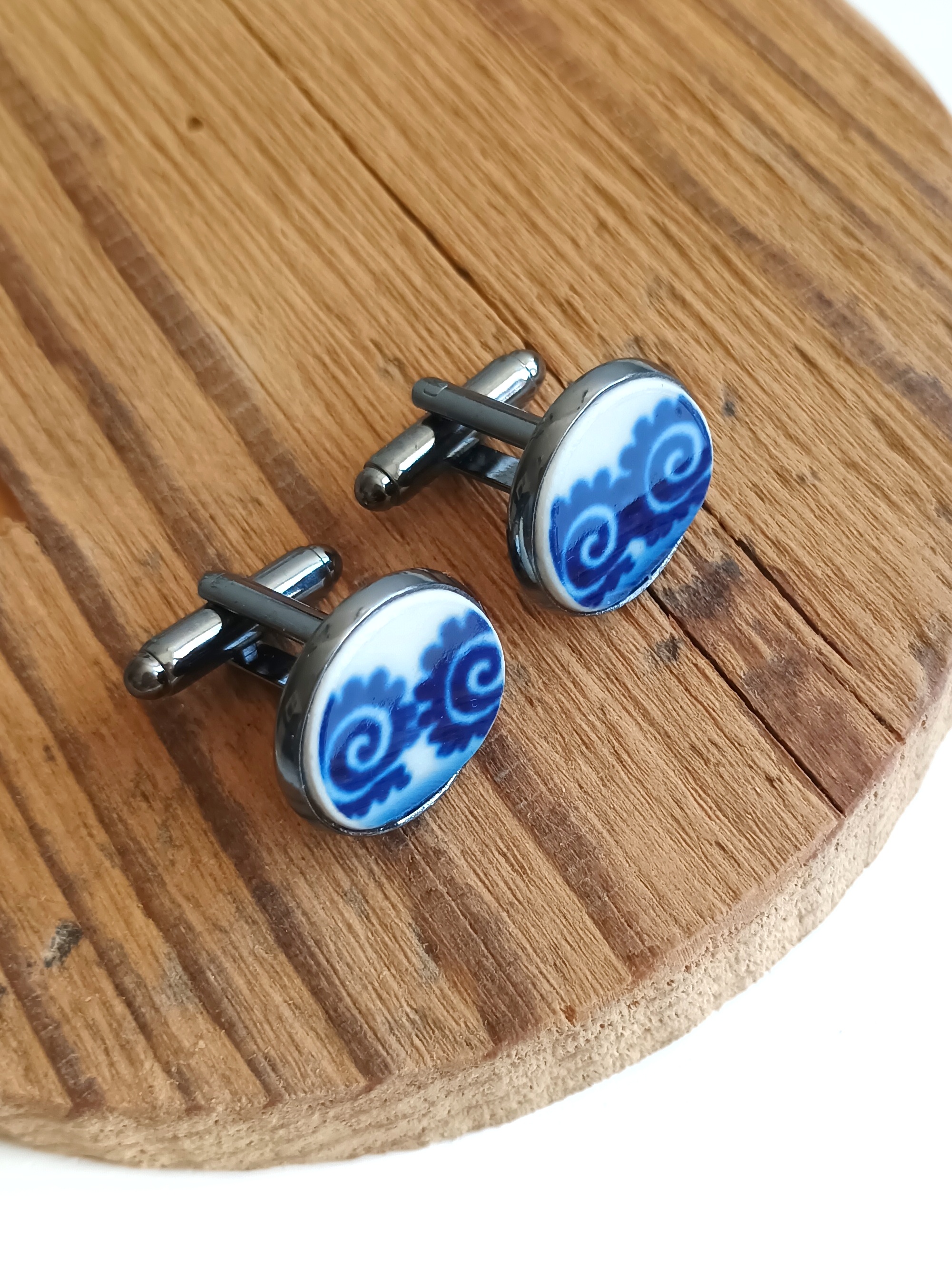 Ceramika w Bolesławcu i jego okolicach produkowana była już w XIV wieku. Do dziś najważniejszy surowiec, czyli glina wydobywany jest na miejscu, a tradycja wyrobu naczyń ceramicznych, rozwijana i kultywowana przez wieki - trwa. Bolesławiec jako marka, tworzona przez kilkadziesiąt różnych manufaktur, znana jest na całym świecie, a charakterystycznego wzoru w kobaltowe kropki nie sposób pomylić z żadnym innym. Co najbardziej wyróżnia Bolesławiec, to że szkliwo nakładane jest ręcznie, za pomocą stempelków z gąbki. Oto spinki do mankietów, które wykonałam z fragmentów stłuczonego kubka, wykonanego właśnie w Bolesławcu. Kawałki stłuczki oszlifowałam w okrągłe kształty i połączyłam z metalowymi zapięciami w kolorze grafitowym. Ceramikę zeszlifowałam również z grubości - jest cieńsza niż pierwotnie, dzięki czemu spinki nie są masywne. Brzegi pokryłam lakierem, co sprawia, że nie brudzą się i nie chłoną wilgoci. Średnica elementów ceramicznych: 16 mm. Unikat - każdy z moich wyrobów występuje w jednym egzemplarzu. Upcykling - nie reprodukuję wykorzystywanych wzorów, niczego nie domalowuję - wykorzystuję wyłącznie oryginalne naczynia i motywy, które się na nich znajdują. Tym samym, stłuczce z odzysku nadaję nowe życie.
