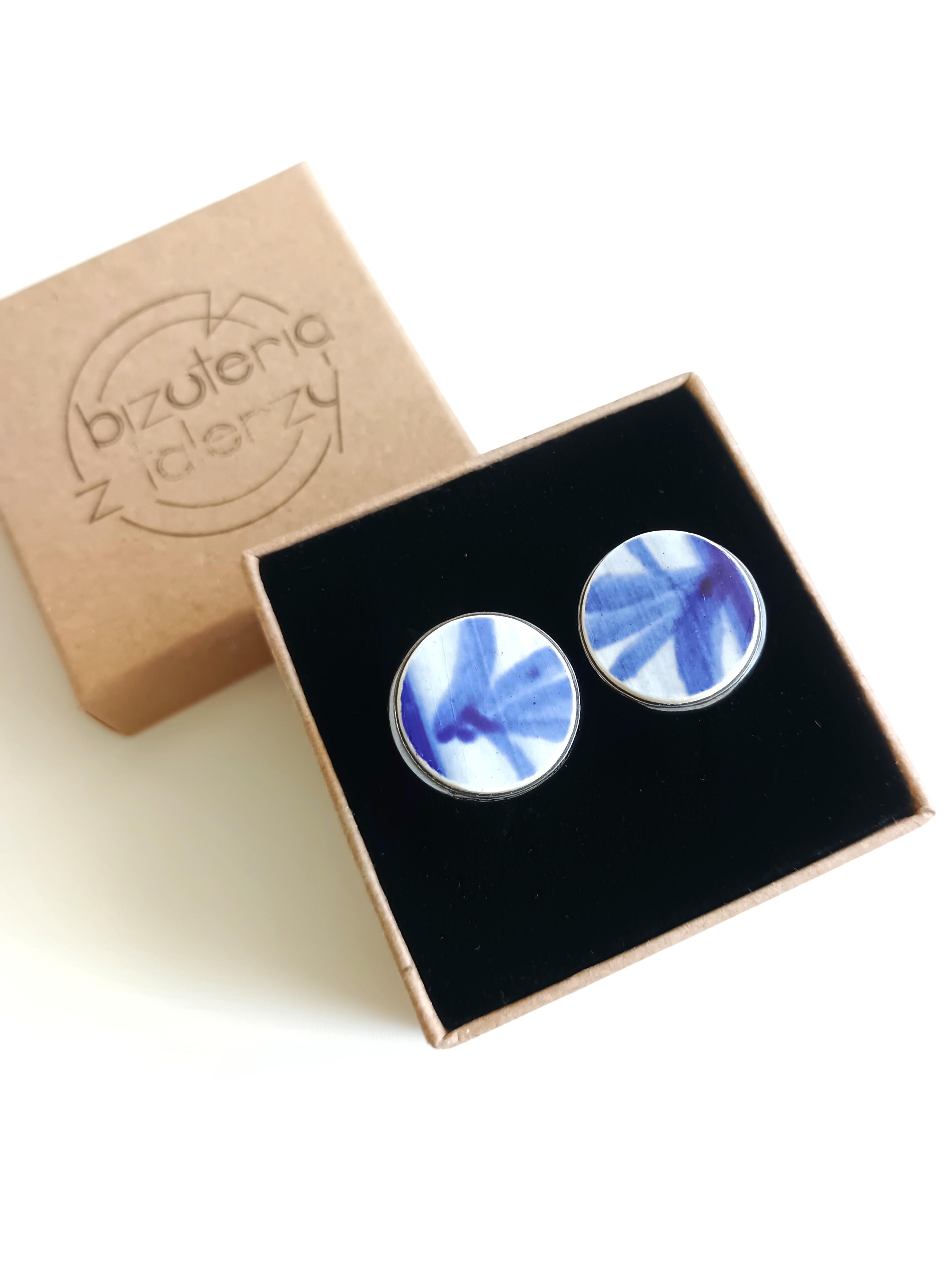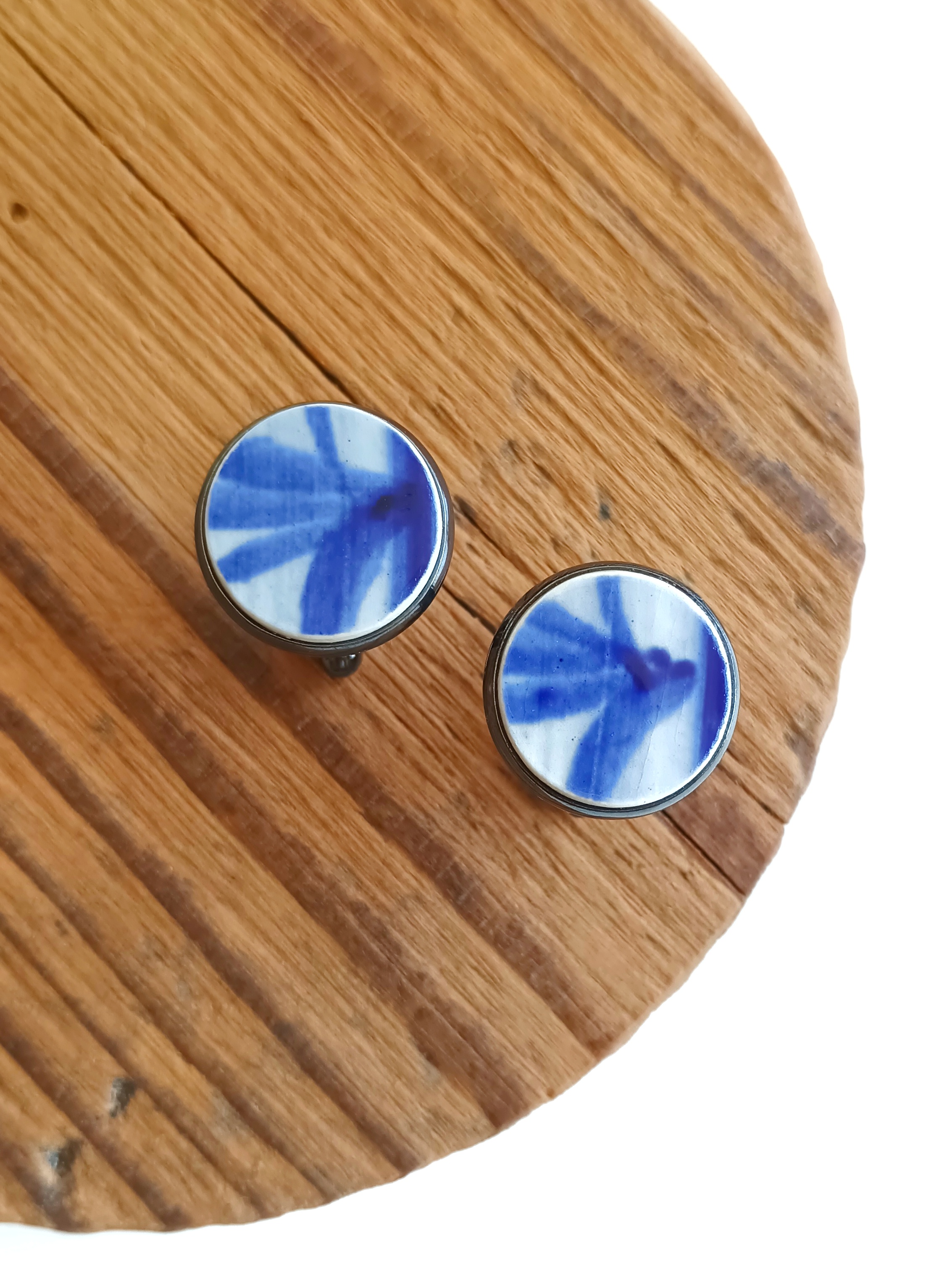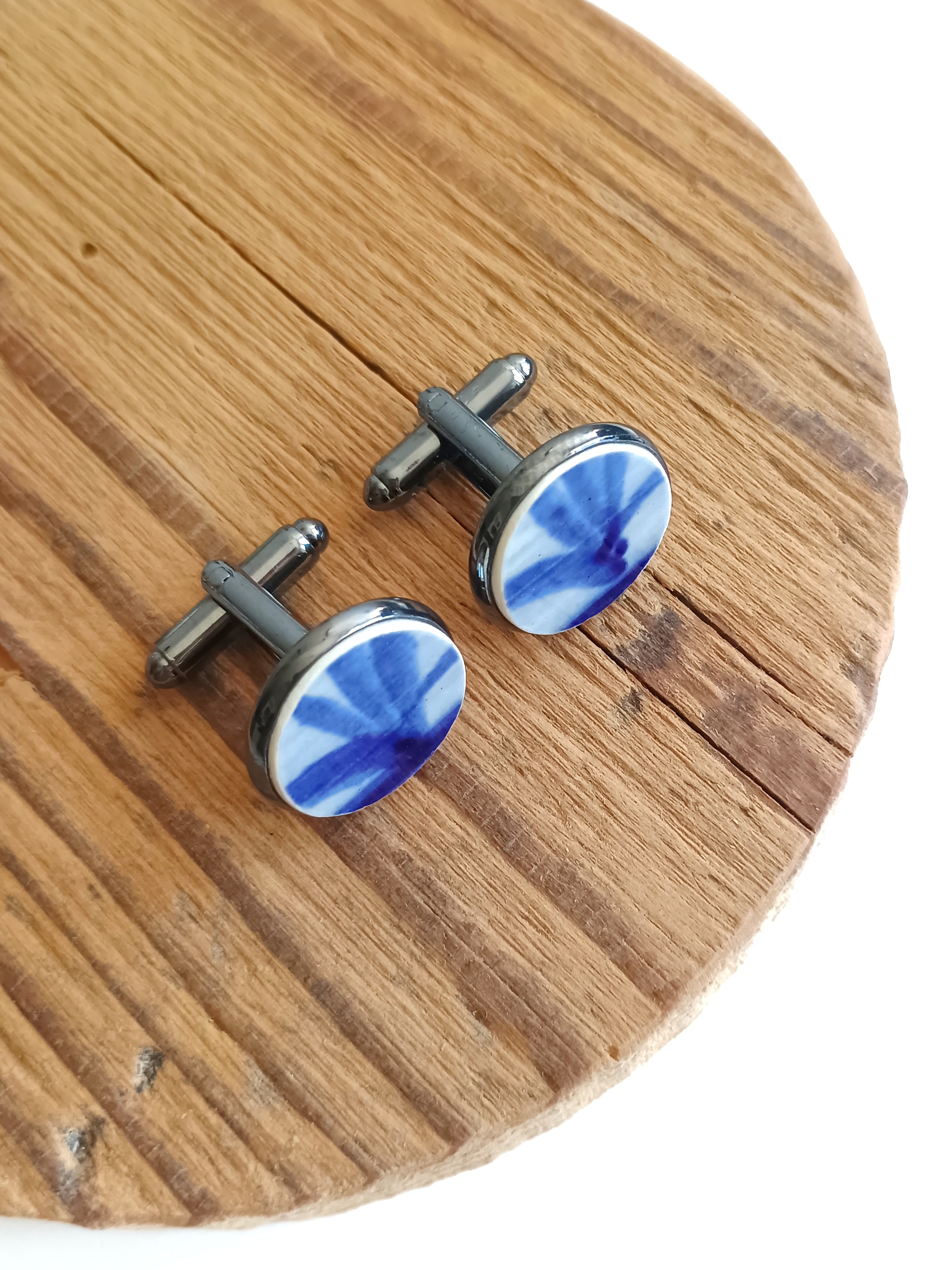 Historia fajansu włocławskiego sięga 1873 roku. Zakładów było kilka, zmieniali się właściciele i lokalizacje. Produkcja najbardziej rozwinęła się po II WŚ, kiedy w miejscowych zakładach powstawał nie tylko fajans, ale również porcelit i porcelana. Zróżnicowane było także wzornictwo - produkowano nie tylko naczynia, ale również elementy wyposażenia wnętrz (lampy, świeczniki, żyrandole). Mimo tej różnorodności, najbardziej rozpoznawalnym wyrobem z Włocławka jest talerz w ręcznie malowane kobaltowe kwiaty (z takich najchętniej korzystam :). I mimo, że najdłużej działająca fabryka zakończyła działalność w 1991 roku, dzięki lokalnym inicjatywom produkcja fajansu została wznowiona i trwa do dziś! Oto okrągłe spinki do mankietów, które wykonałam z fragmentów fajansu włocławskiego ręcznie malowanego w kobaltowe wzory. Kawałki stłuczki oszlifowałam i połączyłam z metalowymi zapięciami w kolorze grafitowym. Ceramikę zeszlifowałam również z grubości - jest cieńsza niż pierwotnie, dzięki czemu spinki nie są masywne. Brzegi pokryłam lakierem, co sprawia, że nie brudzą się i nie chłoną wilgoci. Średnica elementów ceramicznych: 16 mm. Spinki zapakowane są w eleganckie eko pudełko. Unikat - każdy z moich wyrobów występuje w jednym egzemplarzu. Upcykling - nie reprodukuję wykorzystywanych wzorów, niczego nie domalowuję - wykorzystuję wyłącznie oryginalne naczynia i motywy, które się na nich znajdują. Tym samym, stłuczce z odzysku nadaję nowe życie.