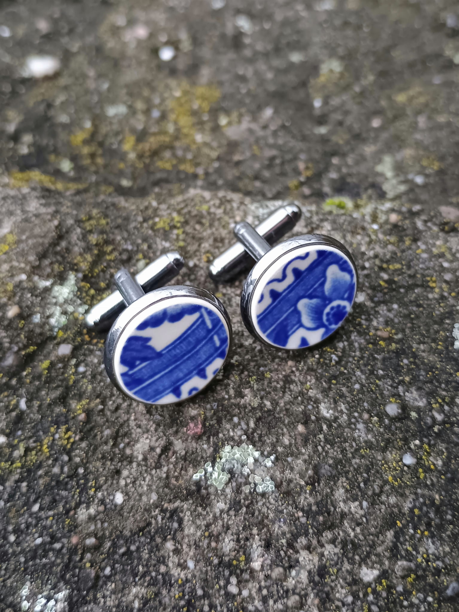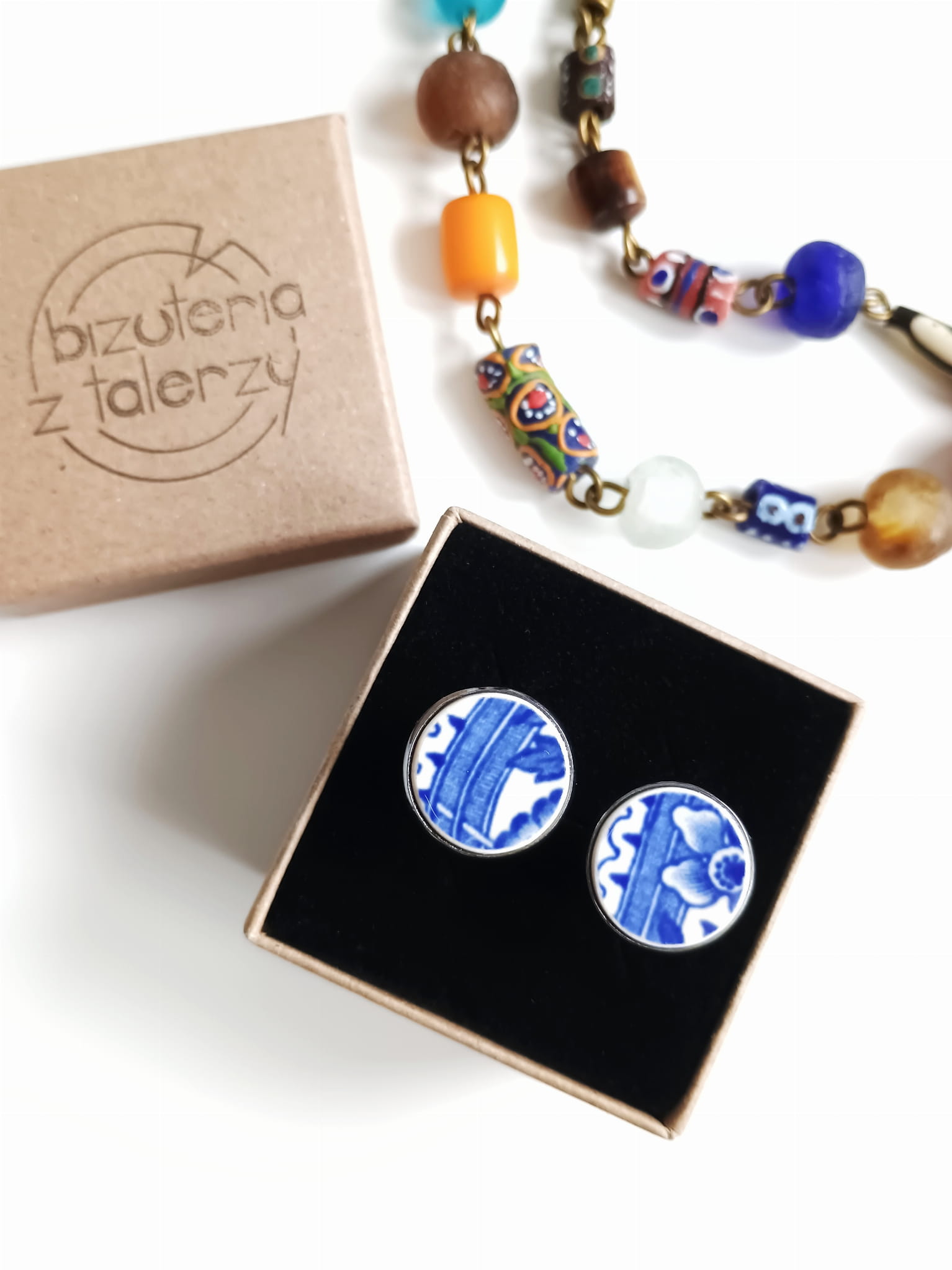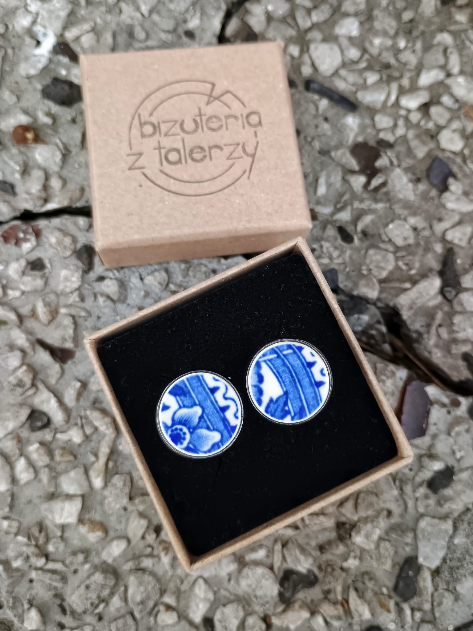 Okrągłe spinki do mankietów, które wykonałam z fragmentów stłuczonego talerza Villeroy & Boch w kobaltowe wzory. Kawałki stłuczki oszlifowałam i połączyłam z metalowymi zapięciami w kolorze grafitowym. Ceramikę zeszlifowałam również z grubości - jest cieńsza niż pierwotnie, dzięki czemu spinki nie są masywne. Brzegi pokryłam lakierem, co sprawia, że nie brudzą się i nie chłoną wilgoci. Średnica elementów ceramicznych: 16 mm. Unikat - każdy z moich wyrobów występuje w jednym egzemplarzu. Upcykling - nie reprodukuję wykorzystywanych wzorów, niczego nie domalowuję - wykorzystuję wyłącznie oryginalne naczynia i motywy, które się na nich znajdują. Tym samym, stłuczce z odzysku nadaję nowe życie.